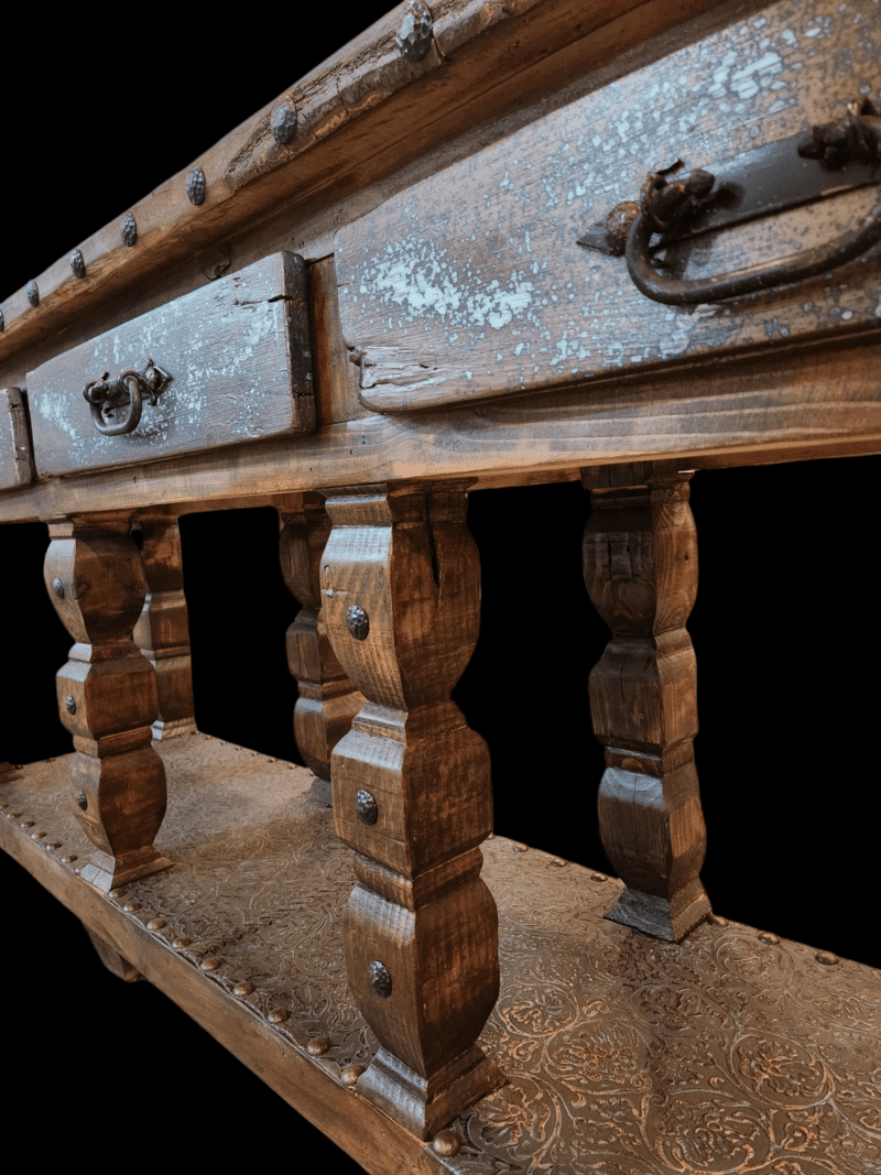 Studded nail heads embellish the sturdy legs and perimeter, adding a touch of rustic elegance that speaks to our dedication to quality and attention to detail. Each nail head is meticulously placed, reflecting the skill and precision of our artisans. The Ada Console Table is not just a piece of furniture; it’s a testament to our commitment to durability and timeless style.