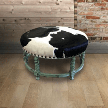 Enhance your home with the captivating charm of The Bellevue Ottoman by Ranch & Co Interiors. Its striking antiqued turquoise finish and the rich black and white cowhide upholstery seat make it a statement piece in any room. Crafted with the utmost precision using premium leathers and Brazilian Cowhide, this ottoman doubles as a coffee table, ottoman, or bench, offering versatility without compromising on style. Tailor your ottoman to your preferences by selecting your desired leather seating and nailhead accents, allowing you to create a personalized masterpiece. For sizes and additional customization, reach out to us at 972-837-6373. Elevate your decor with the exquisite Bellevue Ottoman – where sophistication meets functionality.