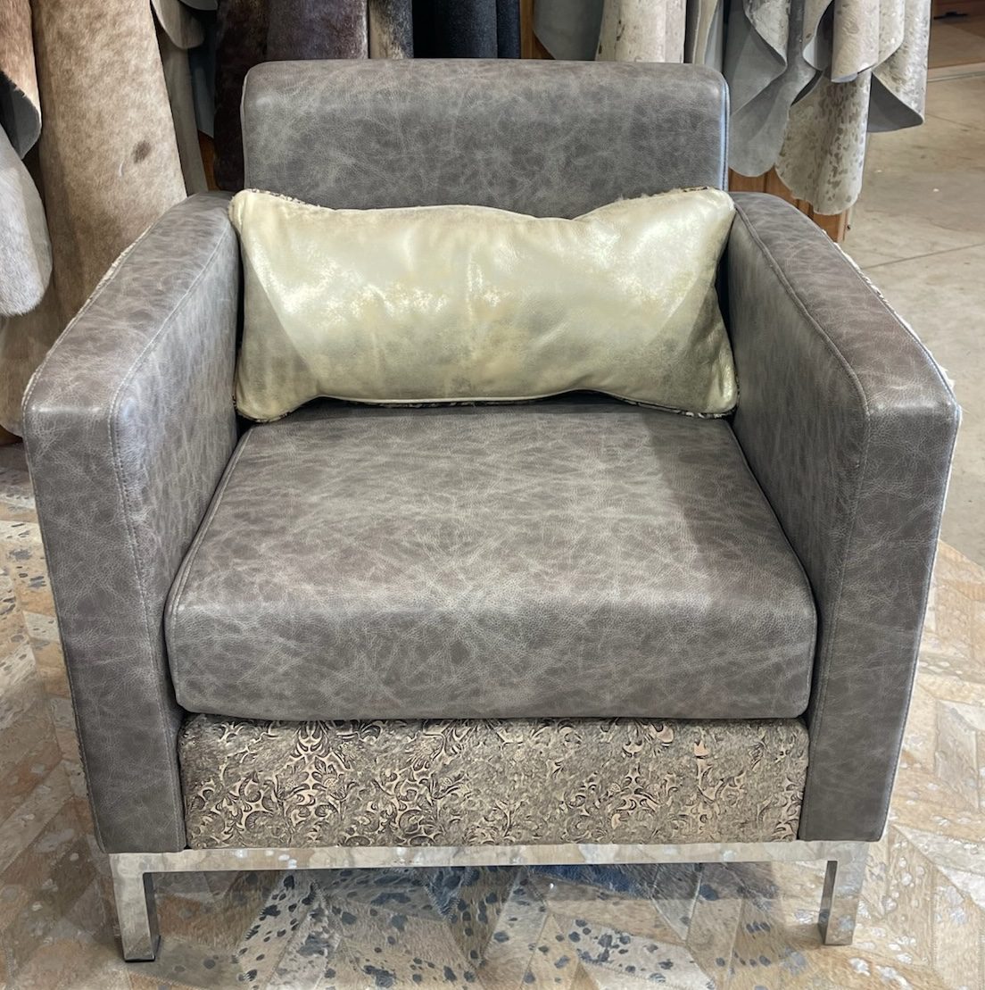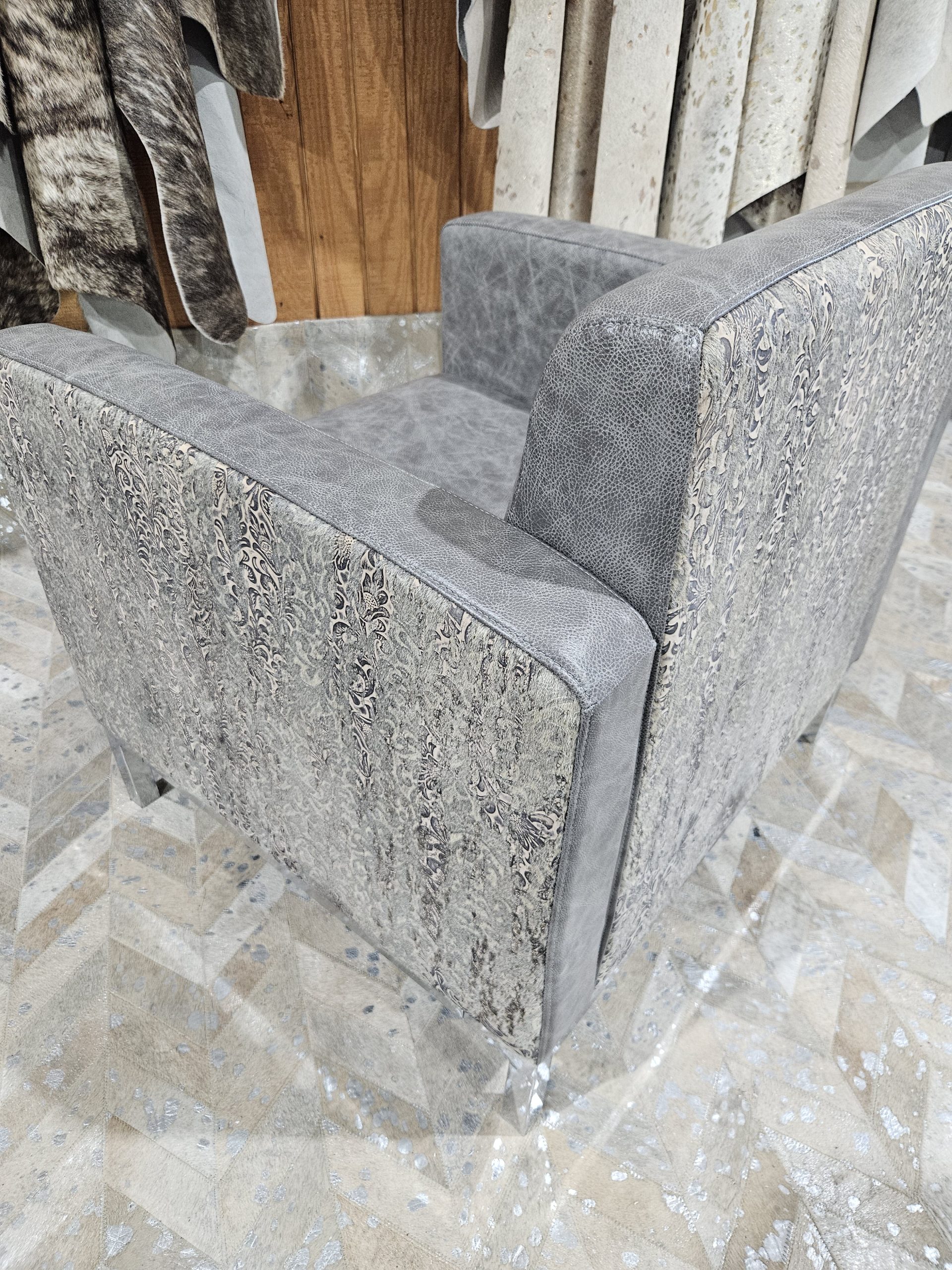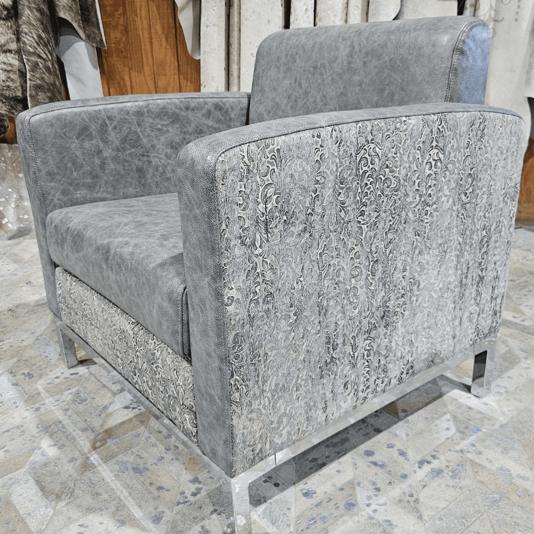 Refined luxury meets bold design in The Glasgow Chair, a statement piece crafted for those with an eye for distinctive style. Its oversized cubic silhouette is upholstered in custom grey floral-embossed leather, beautifully complemented by a medium-tone grey “reptile look” suede cushion. A sleek chrome base adds a touch of modern sophistication, creating a striking balance between contemporary elegance and timeless craftsmanship.