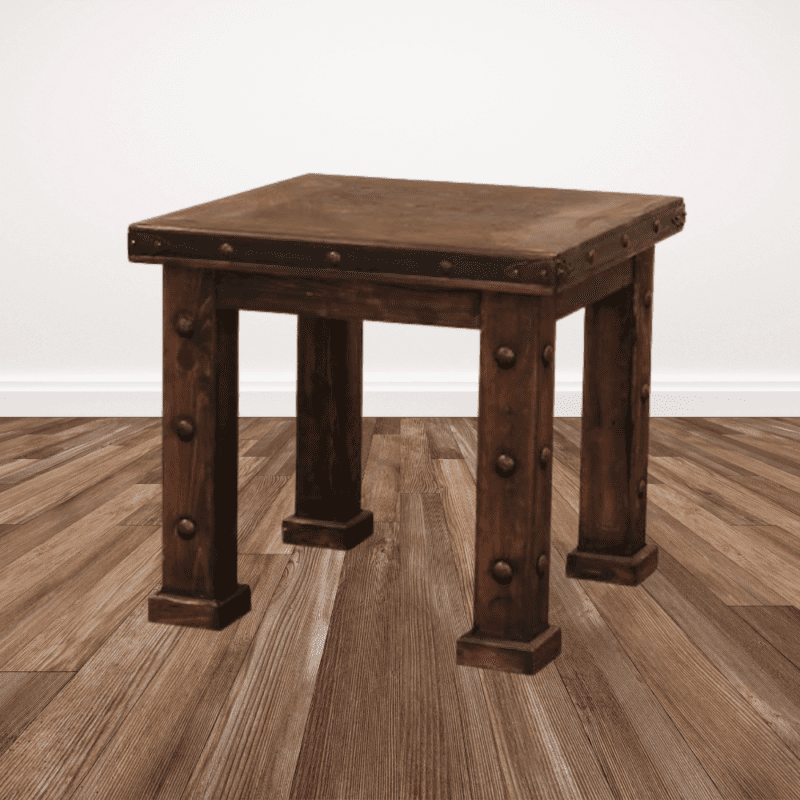 Discover the timeless charm of The Holly side table from Ranch & Co Interiors. This western-style square wooden side table is not just furniture; it’s a piece of artistry. Adorned with studded nail heads on the legs and around the perimeter, every detail exudes craftsmanship and sophistication.