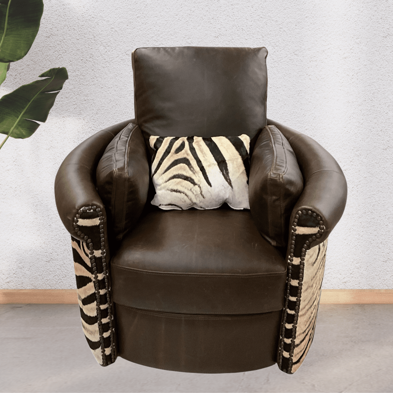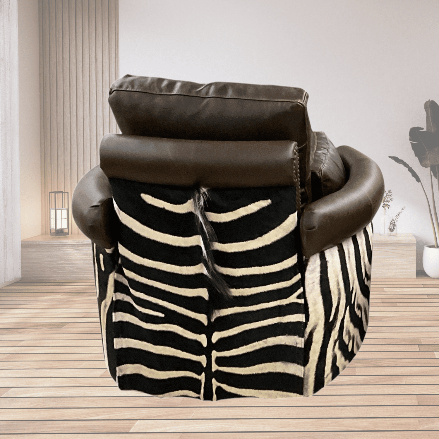 Crafted for those who dare to stand out, this custom-made swivel recliner is wrapped in rich, full-grain leather and accented with striking, authentic zebra hide. From its oversized armrests to its smooth 360° swivel and recline functionality, every detail is designed for comfort with a statement.
