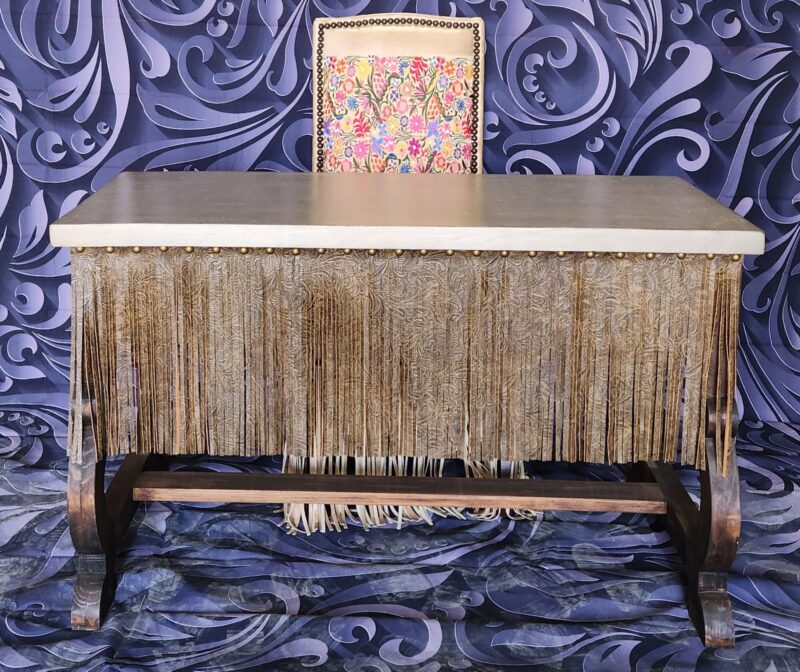 Constructed from the finest materials, The Magnolia Desk is both sturdy and durable. This desk is hand-painted with a custom-crafted rustic platinum finish. The desk’s five spacious drawers provide ample storage for all your office essentials, while the fringe detailing adds a touch of elegance and sophistication.