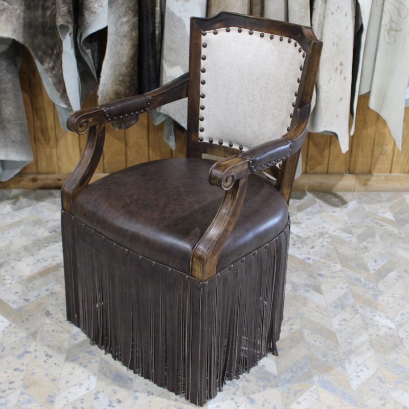 Each chair is expertly handcrafted with a hand-stained hardwood frame, rich chocolate leather seat, and an embossed longhorn backrest—a proud nod to Western heritage. Floor-length fringe delivers dramatic flair, while hand-applied nailhead trim adds timeless texture and a distinctly custom finish.