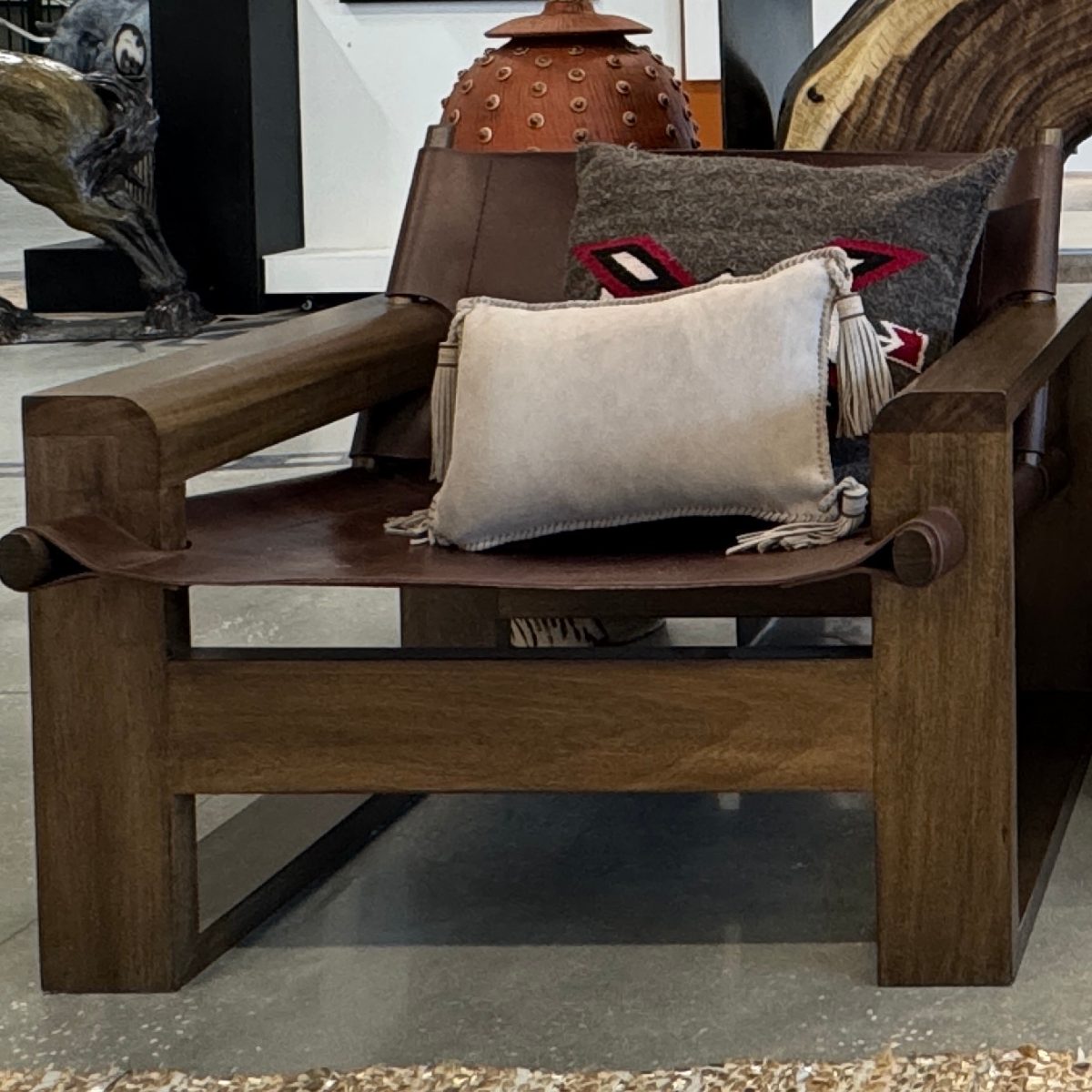 This truly unique chair showcases beautifully crafted wood that highlights the natural grain and strength of the material, creating a warm and sturdy frame. What sets The Ponca City Chair apart is its distinctive leather seat that appears to float within the wooden structure, giving the chair a light, sculptural feel while maintaining a strong western presence.