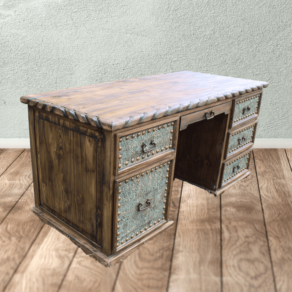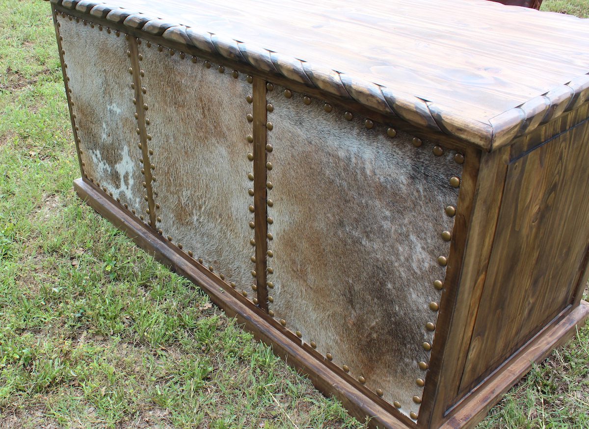 Embrace the essence of the Wild West with our Red Bluff Desk adorned in tan cowhide. Crafted from solid American knotty alder wood, this desk exudes rustic charm and durability. Welcome timeless sophistication into your workspace with the Red Bluff Desk from Ranch & Co Interiors. The outer front panels are adorned with rich, masculine embossed gator leather accents, adding a touch of rugged elegance to your office or home. Featuring three customizable panels on the front side, the Red Bluff Desk offers a bespoke design tailored to your unique space requirements. The desktop is adorned with handsome top-grain wood and antiqued nailhead trim, showcasing meticulous craftsmanship and attention to detail. Whether you’re seeking a refined addition to your office or a statement piece for your home, the Red Bluff Desk delivers exceptional quality and style. Elevate your workspace with this blend of rustic allure and functional design.