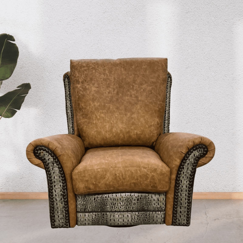 Indulge in the luxury of choice with a selection of premium leather options and authentic cowhide accents, allowing you to personalize your recliner to match your unique style. The Santa Fe Swivel Glider Recliner features a special blend of exquisite tan leather adorned with carefully placed nail heads that enhance its visual appeal.