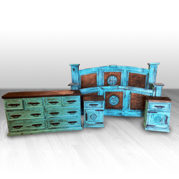 The centerpiece of this collection is the Santa Maria bedframe, adorned in a distinctive rustic Texas Turquoise finish that exudes warmth and character. The cowhide accents artfully woven into the design add a touch of authenticity, elevating the bed’s aesthetic to a new level of visual delight.