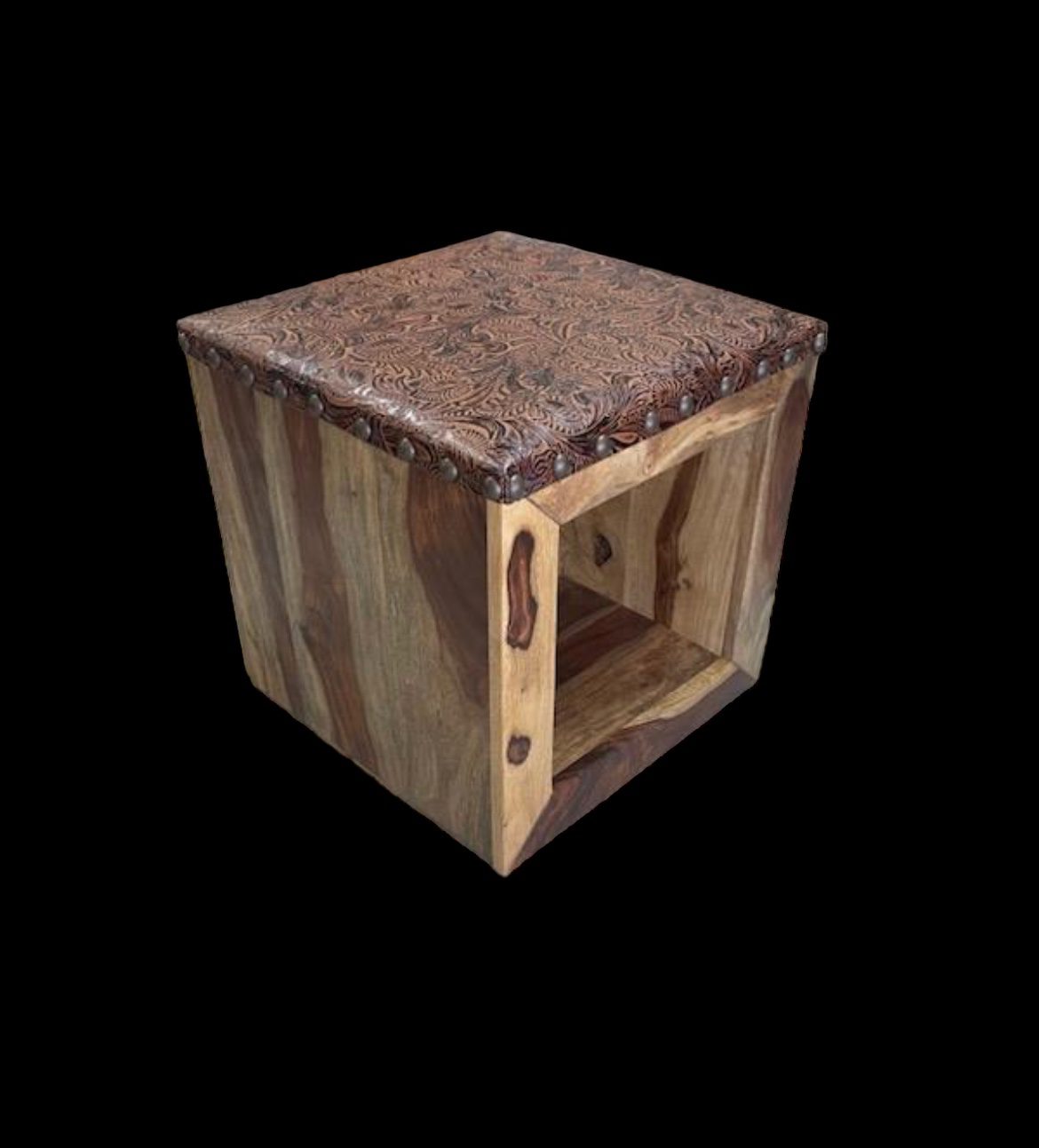 The West Plains Side Table is a square wood side table with brown embossed leather decorating the top to create a western wood look.